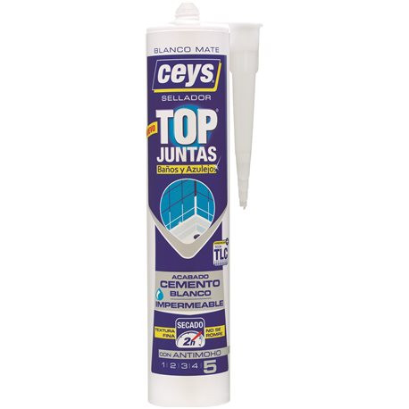Sellador acabado cemento blanco. Ceys top juntas baños y azulejos es un sellador 100% impermeable con textura y acabado de obra, tipo cemento blanco fino que no se rompe. Indicado para rellenar cualquier tipo de junta del baño (duchas, bañeras, juntas entre azulejos en paredes). Seca en sólo 2h. Es 100% impermeable. Forma una barrera repelente al agua y evita filtraciones de agua a través de la junta. La exclusiva tecnología tlc evita que el moho y la suciedad se depositen sobre el sellador, con lo que no ennegrece y permanece limpio y sin moho 5 veces más tiempo que un sellador normal cocinas y baños. Nivel anti moho extra fuerte nivel 5