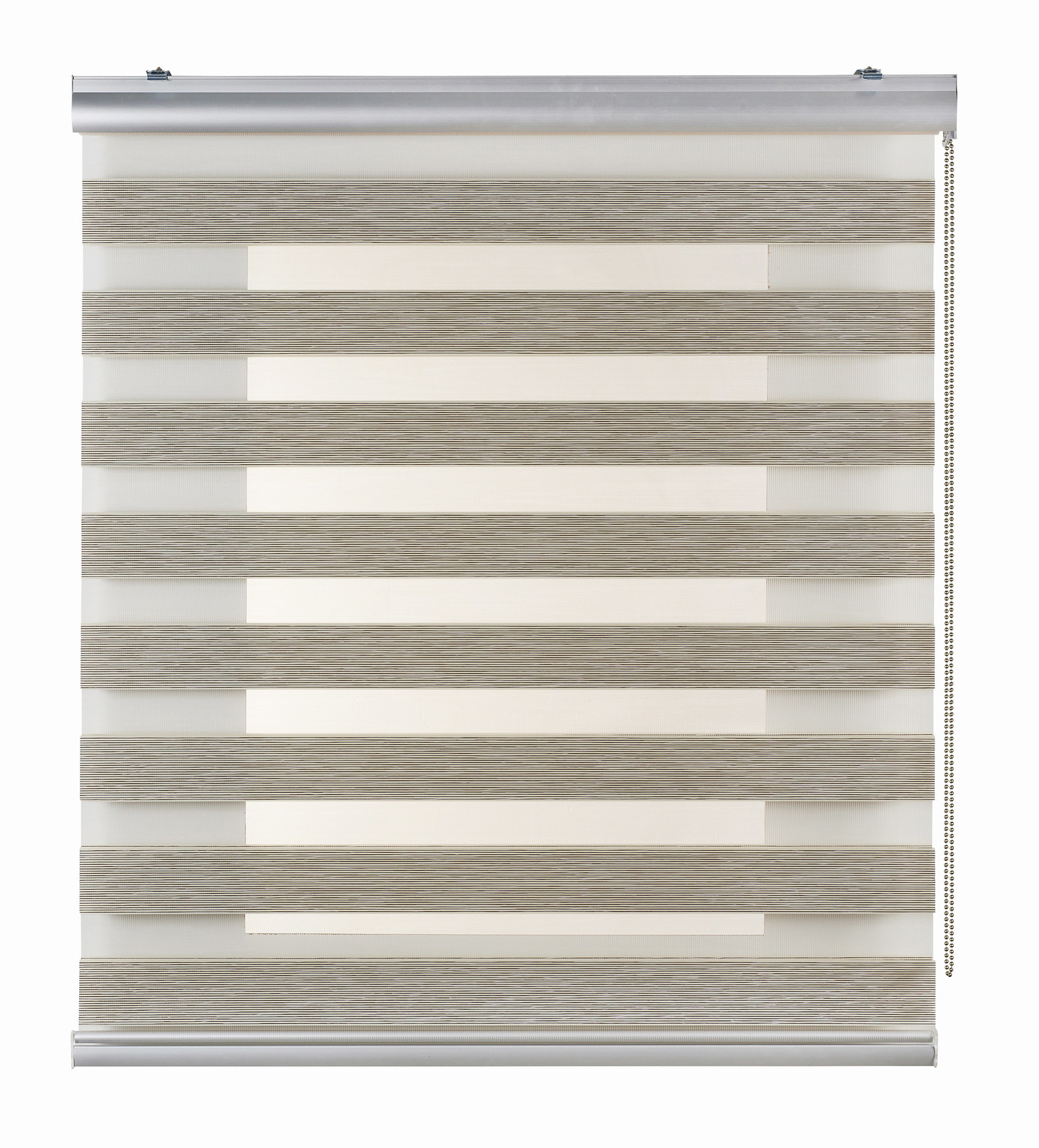 Estor enrollable doble en tejido de franjas transparentes cuyo movimiento vertical proporciona un decorativo y práctico juego de luz, así como el control de la visión exterior y la privacidad. Mecanismo con cajetín superior y contrapeso de aluminio.