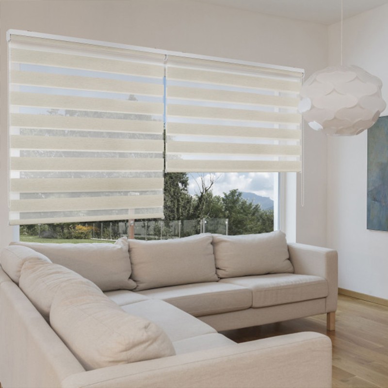 Estor enrollable doble en tejido de franjas transparentes cuyo movimiento vertical proporciona un decorativo y práctico juego de luz, así como el control de la visión exterior y la privacidad.