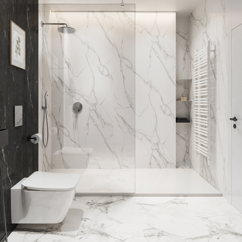 El diseño Elegance presenta un mármol blanco con delicadas vetas grises y acabado mate, ideal para crear ambientes luminosos, serenos y atemporales. Su estética sobria combina perfectamente con interiores modernos y clásicos.