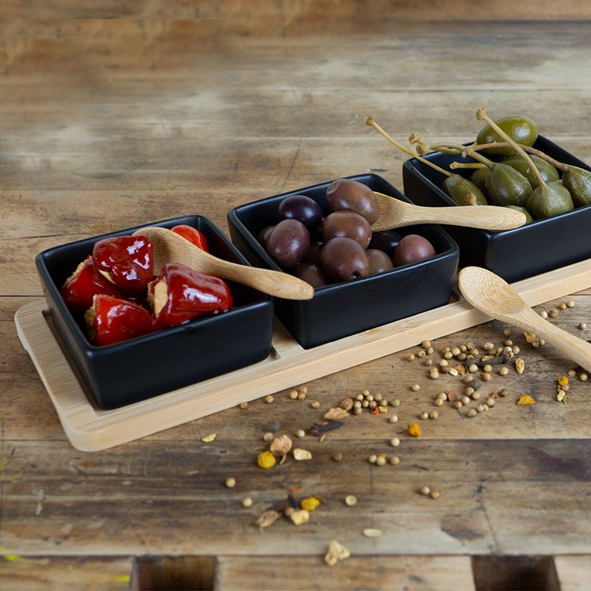Este juego es perfecto para completar tu menaje, lo podrás utilizar en todas las ocasiones por su calidad y elegancia. Está fabricado en cerámica de color negro con una base y 3 cucharas de bambú. Los recipientes son aptos para el lavavajillas y microondas y tienen unas medidas de 8x8x3,5 cm. Viene presentado en una caja.